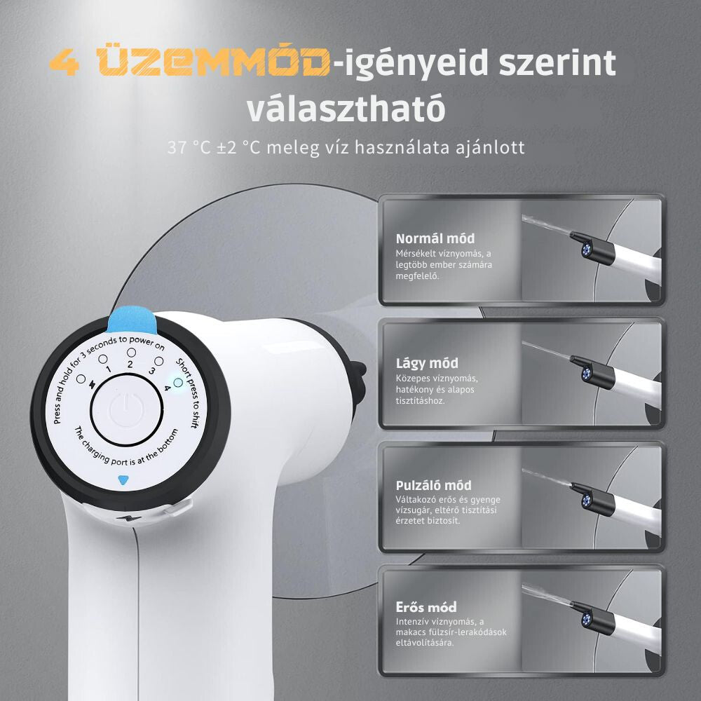 Zariadenie má štyri rôzne stupne tlaku (šetrný, normálny, pulzujúci a silný), takže si každý môže vybrať nastavenie, ktoré mu najviac vyhovuje. Nižšie stupne sú odporúčané pre citlivé uši a pravidelné čistenie, zatiaľ čo silnejšie režimy pomáhajú odstrániť odolnejší ušný maz. Vodná tryska zabezpečuje rovnomerné a kontrolované oplachovanie.
