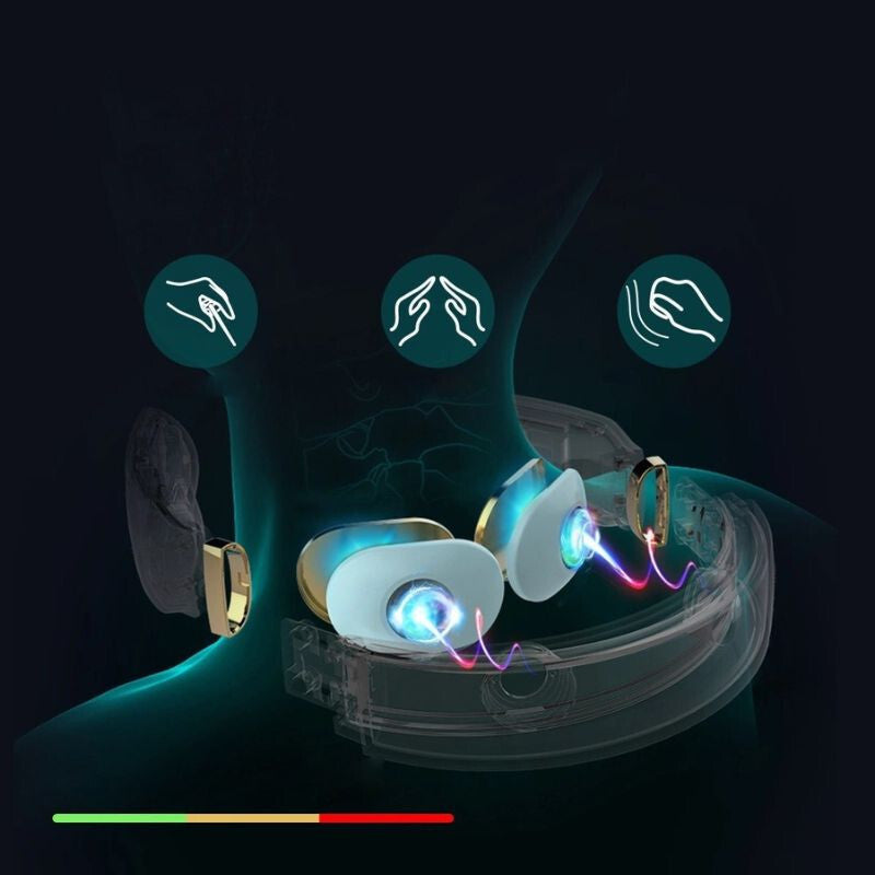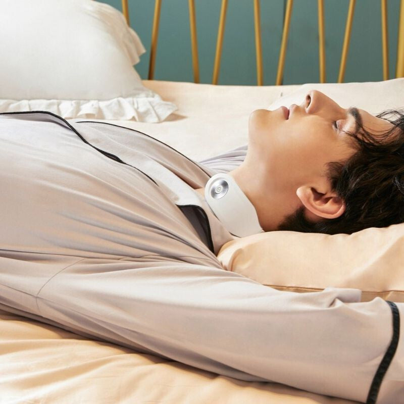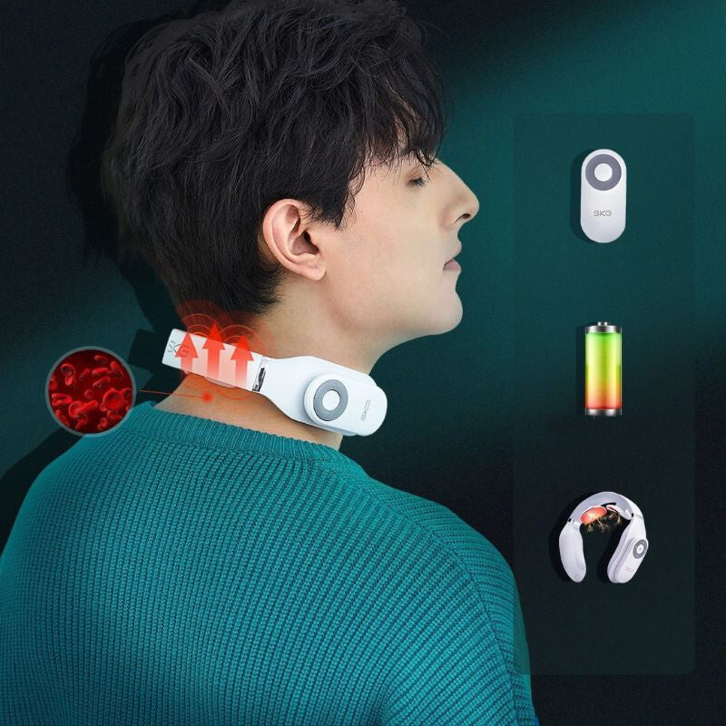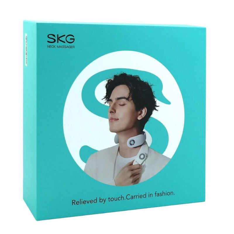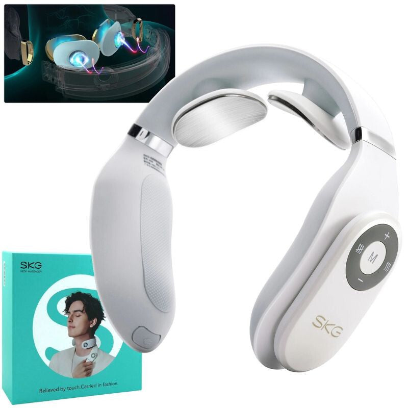SKG 4098E biely masážny prístroj na krk TENS EMS elektroterapia na bolesť krku a uvoľnenie svalov