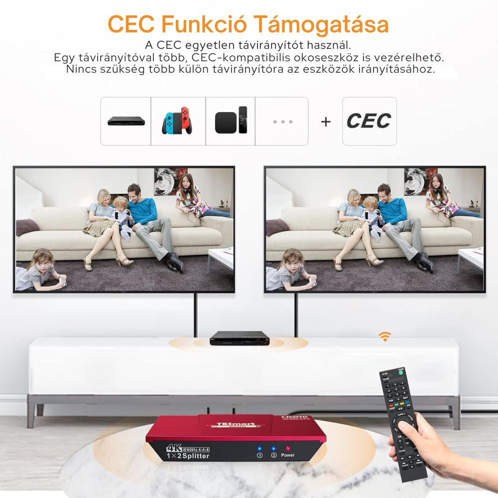 - TESmart HDMI Rozdeľovač – 1x2 (1 vstup 2 výstupy), 4K@60Hz, EDID, CEC, HDCP 2.2