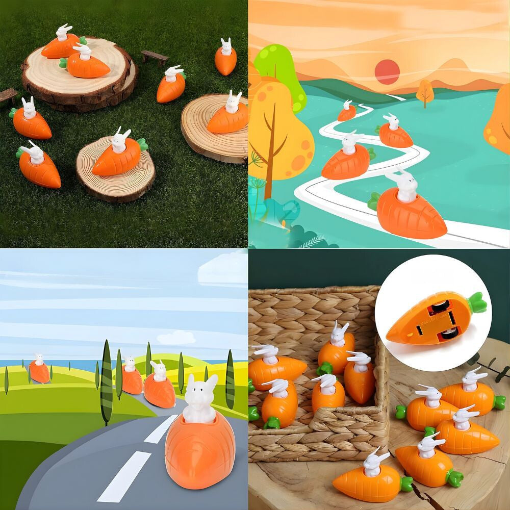 Zajko s dlhými ušami sedí v malom mrkvovom vozíku, ktorý stačí potiahnuť dozadu po hladkom povrchu a potom pustením rýchlo vyrazí vpred.
