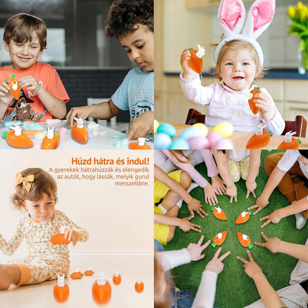 - Natahovací Hračka Zajko Autíčko Set pre Deti – 8 ks Hračkových Autíčok s Mrkvovým Motívom, Veľkonočná a Rozvíjajúca Hračka