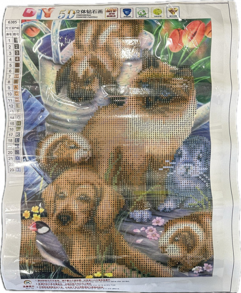 - HD plátno: diamantové komponenty obsahujú vodeodolný olejový lak. Na plátne vytlačené písmená a symboly sú ľahko čitateľné. Lepidlo je silné, takže diamanty nespadnú. Súčasťou je o 30 % viac diamantov, takže ich je dosť na dokončenie obrazu.