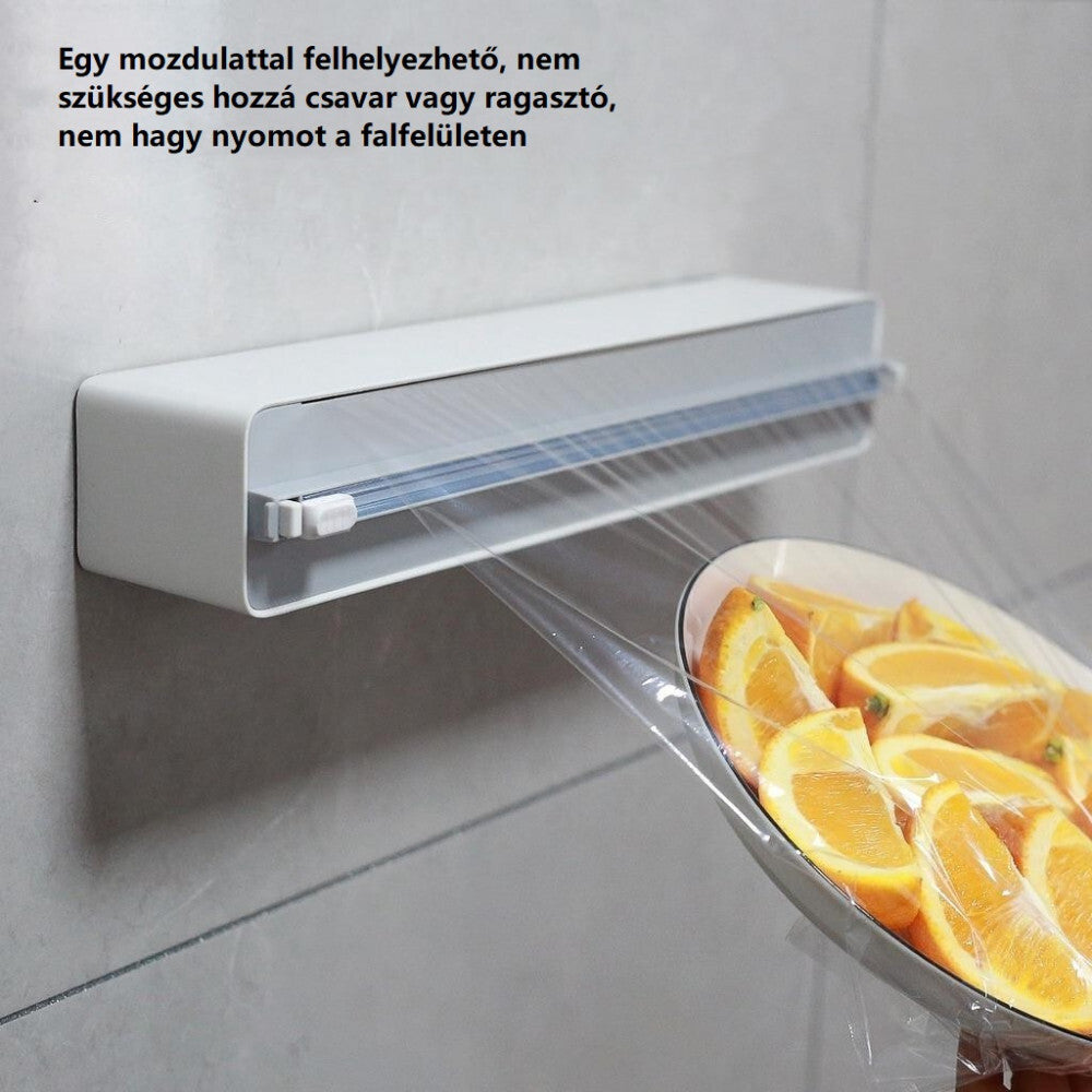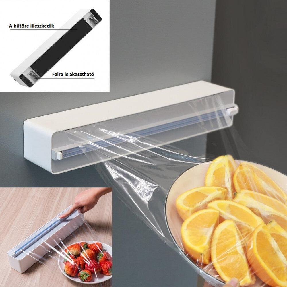 - Vďaka všestrannému dizajnu možno držiak fólie používať s rôznymi možnosťami upevnenia: magneticky na chladničke, s nástennou nálepkou na kuchynskej stene alebo jednoducho položený na pulte. Vždy je tak po ruke, keď ho potrebujete, a zároveň šetrí miesto v kuchyni.