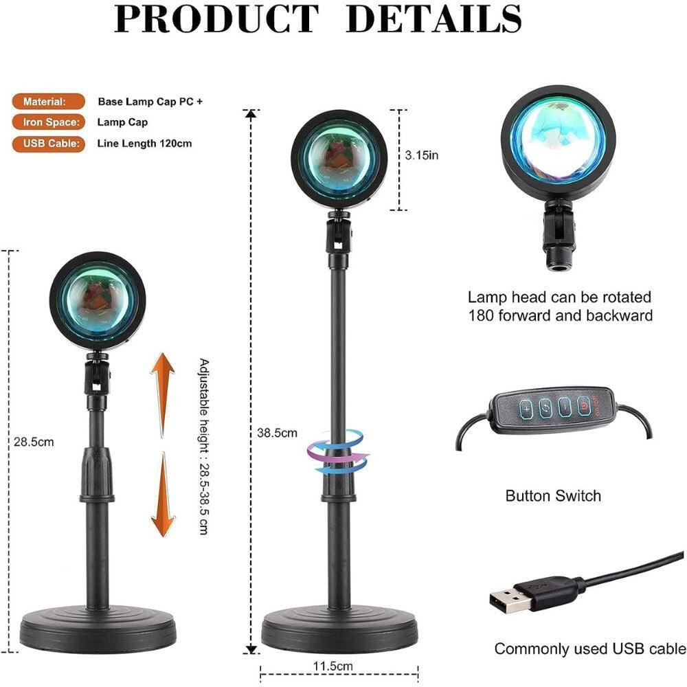 - Objednajte si 180° otočnú USB LED lampu na projekciu západu slnka a užívajte si kombináciu modernej technológie a úchvatnej atmosféry! Je to ideálna voľba na domácu dekoráciu, oddych alebo kreatívnu prácu, pričom nastaviteľné funkcie vám poskytujú úplnú kontrolu.