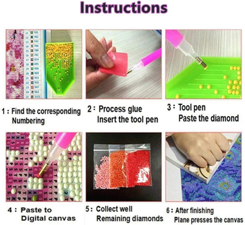 - HD plátno: diamantové komponenty obsahujú vodeodolnú olejovú farbu. Na plátne vytlačené písmená a symboly sú ľahko čitateľné. Lepidlo je silné, takže diamanty nespadnú. Súčasťou je o 30 % viac diamantov, takže ich je dosť na dokončenie obrazu.