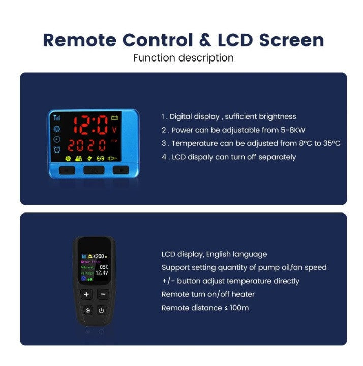 - A Hcalory H037-03 LCD ovládač, je riešenie vybavené najnovšou technológiou, ktoré je ľahko použiteľné a zabezpečuje maximálny komfort suchých naftových vykurovacích systémov. Vďaka Bluetooth ovládaniu je možné ho riadiť aj zo smartfónu, a s priloženým diaľkovým ovládačom ľahko nastavíte všetky parametre. Ideálna voľba pre autá, obytné vozidlá, lode a všetky miesta, kde je spoľahlivé a efektívne vykurovanie nevyhnutné.