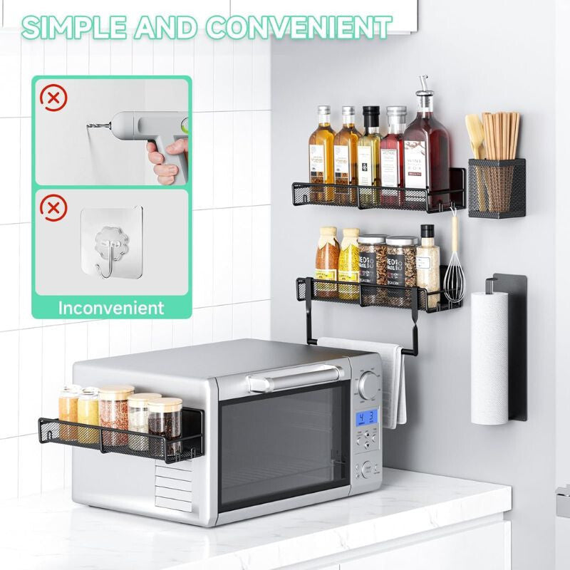 - Set obsahuje 3 police na koreniny, 1 držiak na papierové utierky, 1 držiak na kuchynské náradie a 1 držiak na uterák, ktoré vám pomôžu jednoducho usporiadať kuchynské doplnky. Najväčšia polica má rozmery 32 x 11,3 x 11,2 cm a ponúka dostatok miesta pre často používané koreniny a náradie.