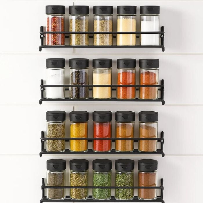 - Koreninové držiaky je možné umiestniť rôznymi spôsobmi: pripevniť na stenu pre maximálne využitie priestoru, upevniť na dvierka skrinky pre skryté uloženie alebo postaviť na kuchynskú linku, aby boli koreniny vždy po ruke. Vďaka jednoliatej konštrukcii ich možno používať samostatne alebo ich skladať na seba a flexibilne prispôsobiť kuchyni.