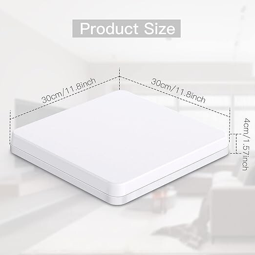 Hrúbka tienidla na stropnú lampu do kúpeľne je 40 mm/1,57 palca, takže je tenké, rozmery sú 300 x 300 x 40 mm/11,81 x 11,81 x 1,57 palca. Materiál tienidla je PC plast, ktorý má vysokú priepustnosť svetla. Okrem toho, moderné štvorcové zapustené stropné svietidlá nestarnú a ľahko nevyblednú.