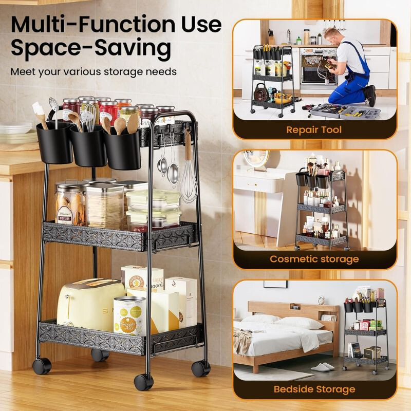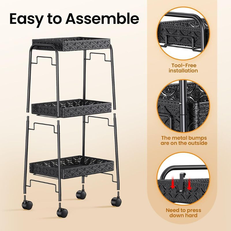 PKBD 3-poschodový kovový úložný vozík na kolieskach - čierny, 40 cm x 30 cm x 75, 5cmTen/Tá/To3-poschodový kovový skladovací vozík PKBD,Je to perfektná voľba pre akúkoľvek časť vášho domova, či už je to kuchyňa, kúpeľňa, kancelária alebo pracovňa. Jeho odolný kovový dizajn a moderná čierna farba budú nielen praktickým, ale aj elegantným doplnkom vášho domova.Hlavné vlastnosti:- Pevná kovová konštrukcia- Vyrobené z vysoko kvalitného kovu, ktorý je odolný voči hrdzi a každodennému používaniu.-3-úrovňový dizajn- Tri police poskytujú dostatok úložného priestoru na organizáciu rôznych predmetov.-Sieťované police- Sieťovaná konštrukcia zaisťuje správne vetranie, takže uskladnené veci zostanú vždy čerstvé.-Uzamykateľné kolesá- Kolieska otočné o 360° umožňujú ľahký pohyb a v prípade potreby sa dajú zaistiť.-Jednoduchá montáž- Nie sú potrebné žiadne nástroje, dá sa ľahko zostaviť za pár minút.-Kompaktná veľkosť- Vďaka rozmerom 40 cm x 30 cm x 75, 5cm je ideálnou voľbou do stiesnených priestorov.-Moderný vzhľad- Čierna farba dodáva eleganciu, takže sa hodí do každého štýlu interiérového dizajnu.Prečo si vybrať 3-poschodový úložný vozík PKBD?Tento úložný vozík na kolieskach je ideálnym riešením, ak si chcete usporiadať svoj domov alebo kanceláriu bez toho, aby zaberal príliš veľa miesta. Jeho odolná konštrukcia a jednoduché používanie zaručujú dlhodobú spokojnosť a upratané prostredie.