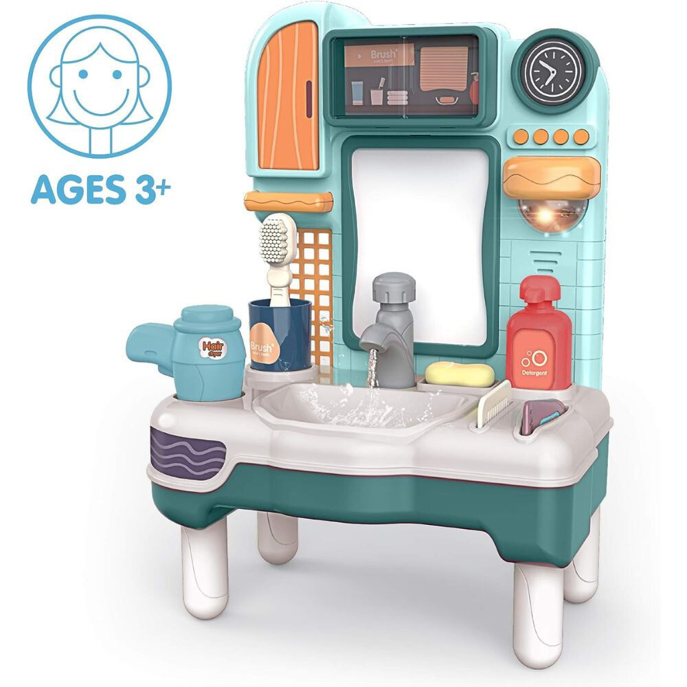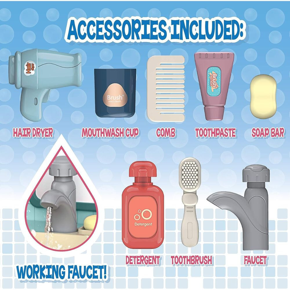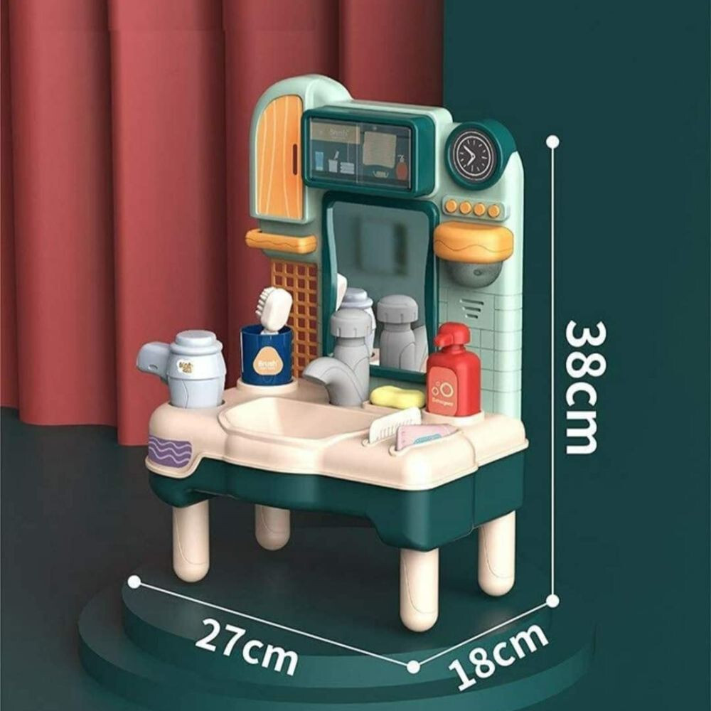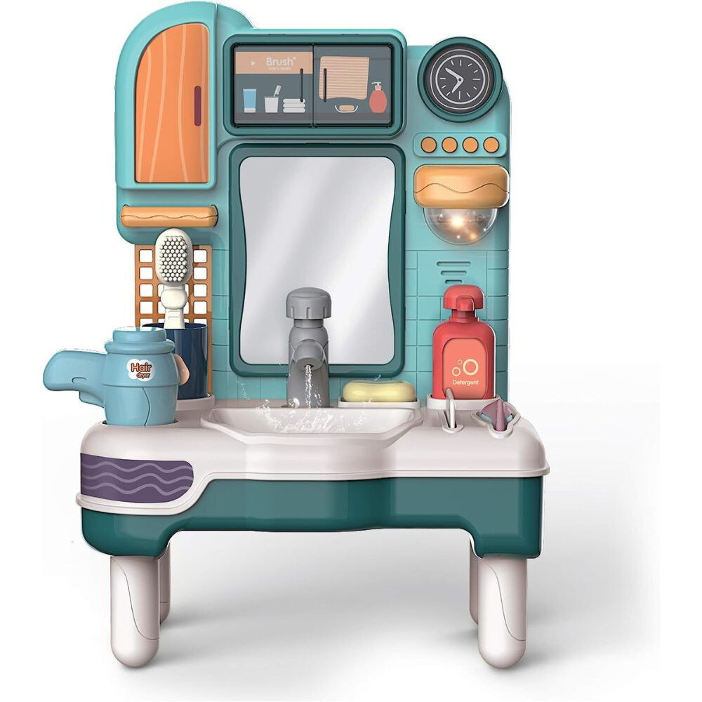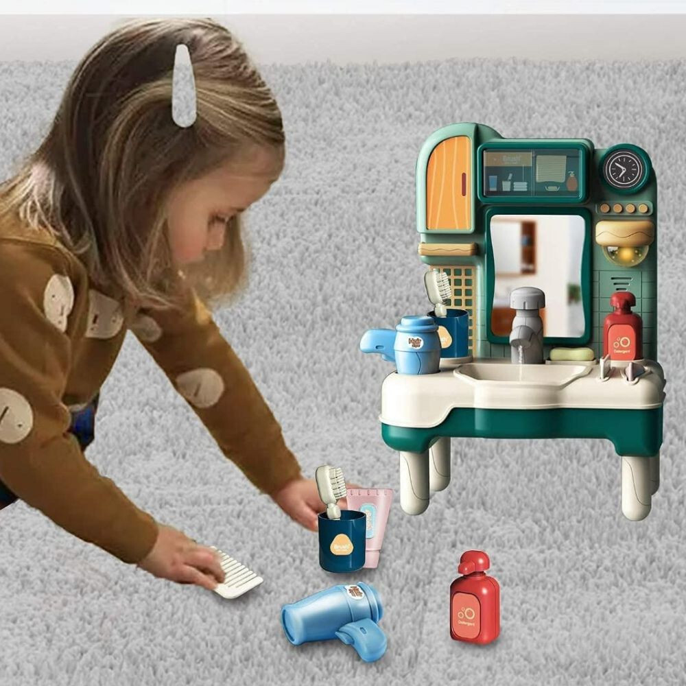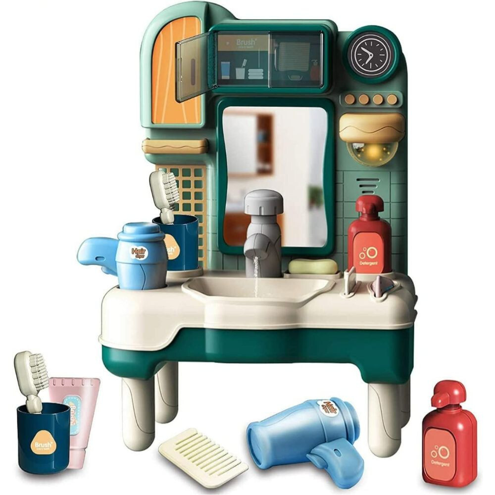 Detská hračka do kúpeľne s umývadlom, kúpeľňovým zrkadlom a toaletnými doplnkami. Skvelá edukačná a zábavná hračka malé kúpeľňové zrkadlo a umývadlo s príslušenstvom.