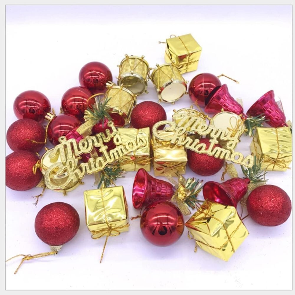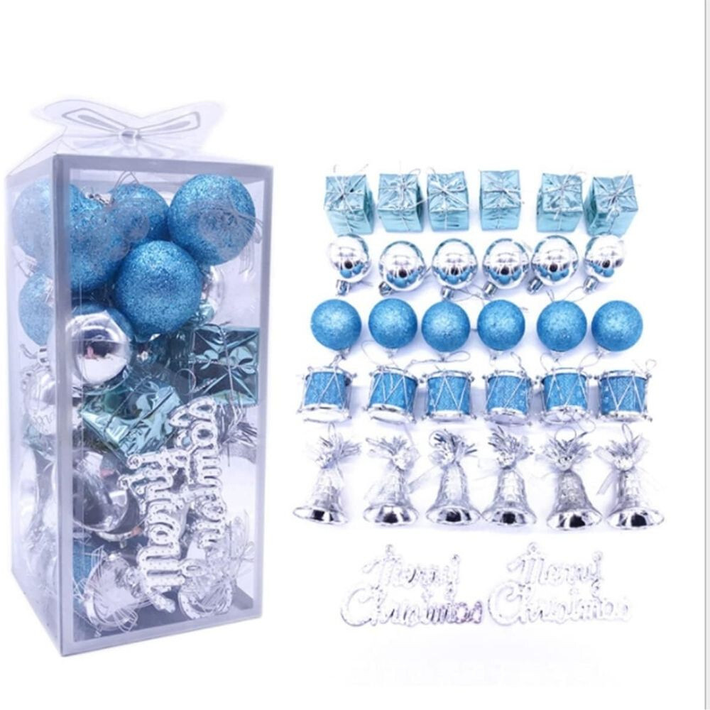 Sada so 64 dielmi sa skladá z dvoch rôznych sád, jednej v modro-striebornej a druhej v červeno-zlatej farbe. Tvary zahŕňajú hladké gule, darčekové krabičky a zvončeky. Materiál je odolný a nie je krehký.